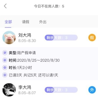 5、还需查询所有请假信息,并对请假及申请外出成员的详情信息进行查询。