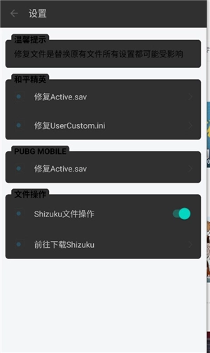 在设置界面中,你可以对和平精英、PUBG MOBILE的文件错误进行修复,也能选择与shizuku进行链接使用。