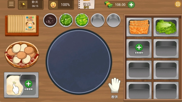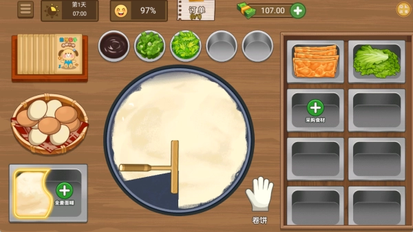 等攒够了钱就能给摊位升级,初级升级能扩大食材架的容量,中级升级则可以解锁面糊自动搅拌的功能。