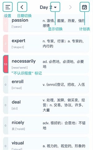 学习页面进入到Day2后,页面中间会展示当前List包含的全部单词,具体显示效果可参考下图: