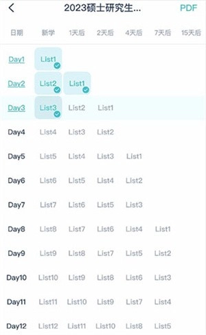 学习计划清单里,每一天的单词学习都包含记忆与复习两个环节,只有当天的记忆和复习任务全部完成,方可开启下一天的学习进程。打勾符号代表对应的记忆或复习任务已完成。就像图中所展示的,Day3已经完成了list3的记忆任务,但还需要完成list1和list2的复习任务,之后才能进入Day4的学习阶段。
