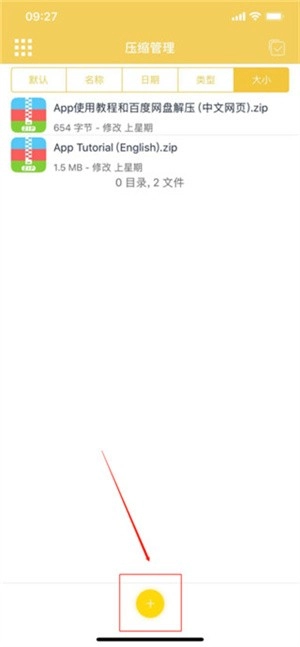 2、完成操作后,在手机主屏幕上找到并打开“解压专家”应用界面。点击软件界面底部的黄色“+”按钮,具体位置可参考下方图示。