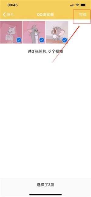 4、打开手机相册界面,把需要打包的照片都选上,然后点击“完成”按钮,操作示意如下图。