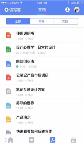 - 文档:文件传输功能十分便捷。能直接把办公文件、电子书等上传到读写客,办公本、PC、手机三个终端可同步查看,支持word、ppt、pdf、epub等多种文件格式;