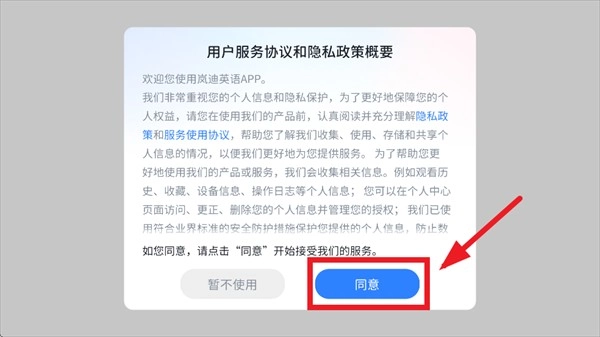 先安装岚迪英语并打开它,然后同意用户服务协议以及隐私政策概要。