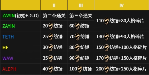● 玩家进行异想解析时,I级和II级阶段只需消耗纺锤.png纺锤即可提升等级;但从III级进阶到IV级,还需要额外消耗对应罪人的自我碎片。