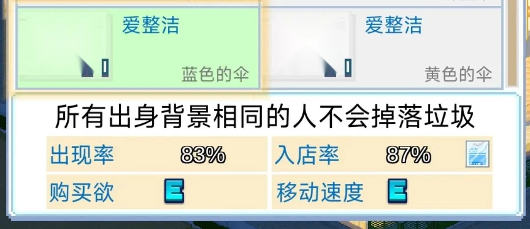 游戏进行到后期,客流量增加后,垃圾问题变得十分棘手。即便店内店外都放置了垃圾桶,而且六个轮班店员的速度都达到了600,捡垃圾的效率依旧赶不上顾客扔垃圾的速度。