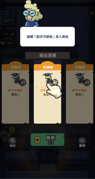 进入关卡后选择增益效果,点击防御塔完成部署操作,并把狐獴守望塔收纳至背包内。