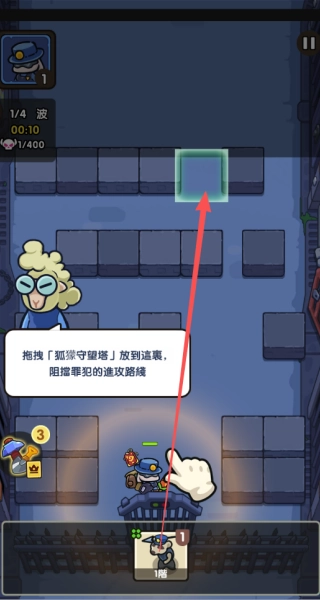 拖拽狐獴守望塔到指定区域,阻挡罪犯的进攻路线。