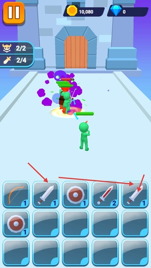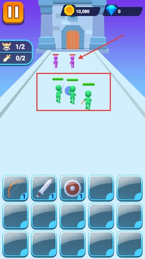 战斗时要操控小兵移动来避开敌人的包围,同时随时留意下方的武器栏,把相同的道具合成起来增强战斗力,提升攻击和防御的能力。