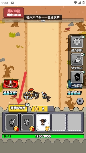 进入游戏后选择普通模式开启挑战,熟悉佣兵招募与技能选择操作,用初始金币组建初步战斗阵容。