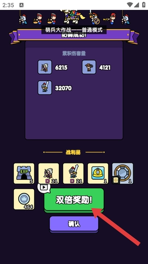 通关之后点击双倍奖励按钮就能拿到丰厚的战利品,积累资源解锁更多英雄,打造出王牌战队。