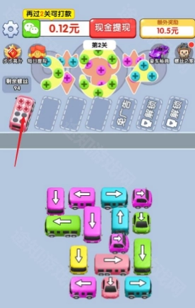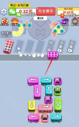 1、玩法上结合了解螺丝和停车位两个游戏,首先我们找到前路畅通无阻的车辆,点击它。