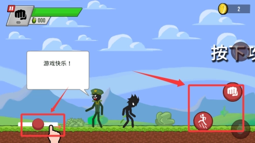 游戏开始时先熟悉基础操作:左手负责控制角色移动,右手则用来操控跳跃与击打动作。