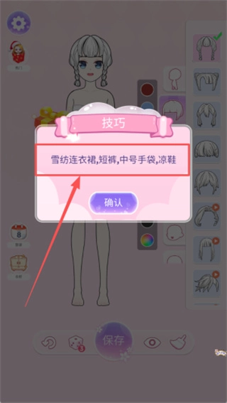 当出现粉色的技巧提示框时,请认真阅读其中关于雪纺连衣裙的搭配建议,之后点击紫色的确认键来关闭该提示。
