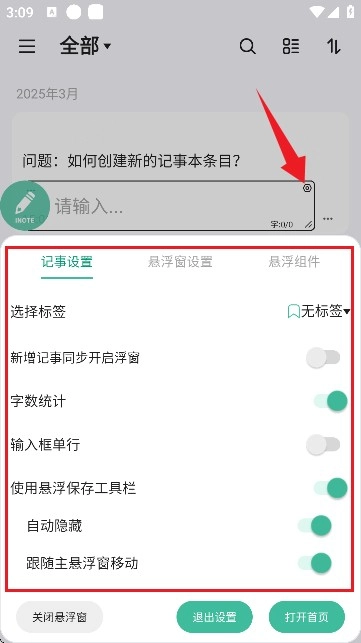 6、接着点击悬浮窗右上角的【设置】按钮,就能对记事功能、悬浮窗显示效果以及悬浮组件进行个性化配置。