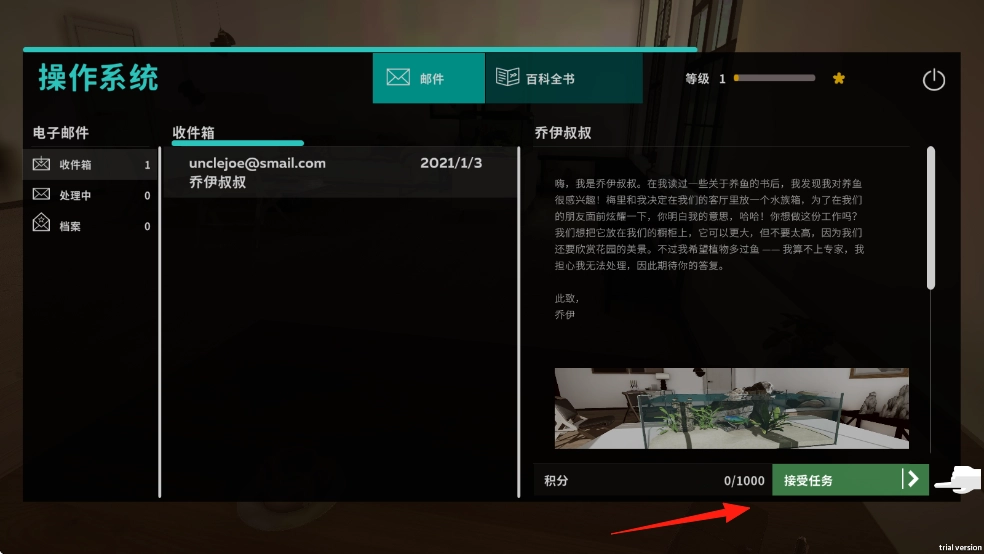 在操作系统里,找到并点击标有红箭头的【接受任务】按钮,领取乔伊叔叔的水族箱订单,然后查看具体需求,包括尺寸和植物方面的限制。