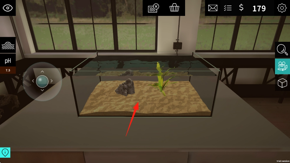 进入水族箱场景后,通过【移动摇杆】(红箭头标识)来调整视角,再点击右侧的【摄像机】(红箭头标识),即可记录下整个搭建过程。
