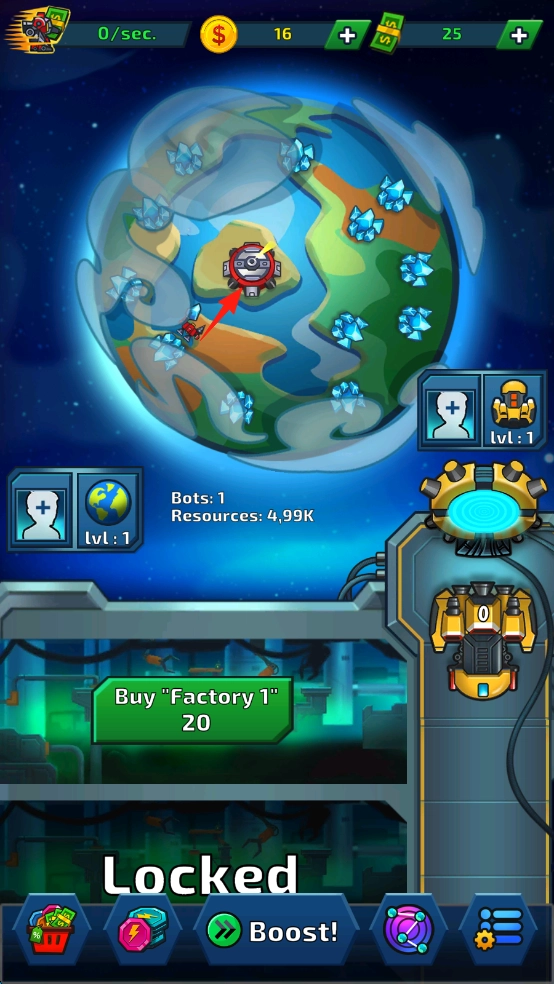 点击【Buy“Factory1”20】(红箭头所指处),花费20个金币来尝试解锁该工厂,以此提升资源的生产能力。