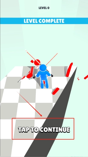 完成关卡后界面会显示“LEVEL COMPLETE”,点击下方的“TAP TO CONTINUE”按钮就能进入下一关,需要留意新场景里红色障碍物的分布有了变化。