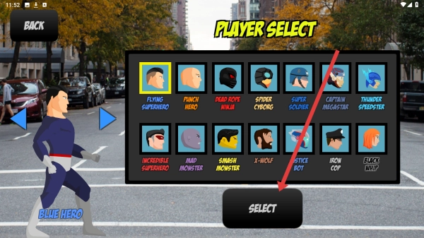 进入角色选择场景(PLAYER-SELECT),挑选心仪的角色造型,点击【SELECT】按钮,开启你的超级英雄街头格斗之旅。