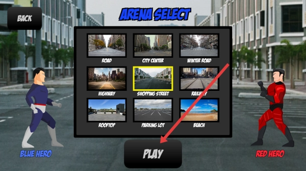 进入场景选择界面(ARENA-SELECT),挑选想要挑战的斗场地(例如SHOPPING-STREET),点击【PLAY】按钮,即可开启街头格斗的游玩。