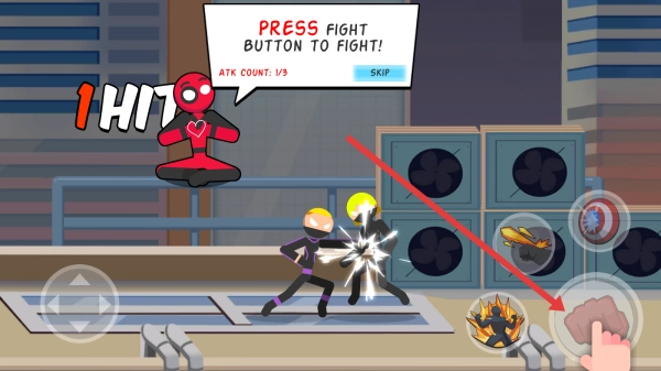 拖动左边的虚拟摇杆来操控火柴人角色移动,在城市屋顶的场景中,要做好战斗准备,避开敌人的攻击,同时调整好自身的站位。