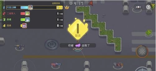看到地图上的武器了吗?走过去,然后捡起它。攻击的按键是右侧最大的那个,看到敌人就按这个键,把他的血条打空,你就成功击杀了,还能获得一次积分。