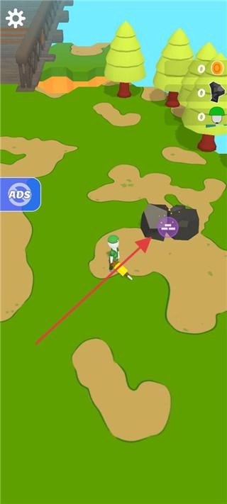 游戏开局场景中,角色正在森林里砍伐黑色树木,界面上显示着金币、木材这类资源,还设有“ADS”广告按钮,可用于加快资源收集进度。