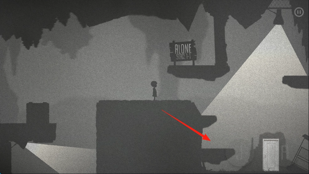 启动游戏时选择灰色球体,操控角色在灰暗的场景中,按照箭头指示的方向前进并完成解谜。
