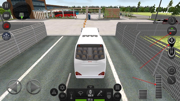 4、进入游戏后,我们要驾驶公交车,通过点击图中所示的启动停止键、换挡杆和加速按钮来启动公交车!