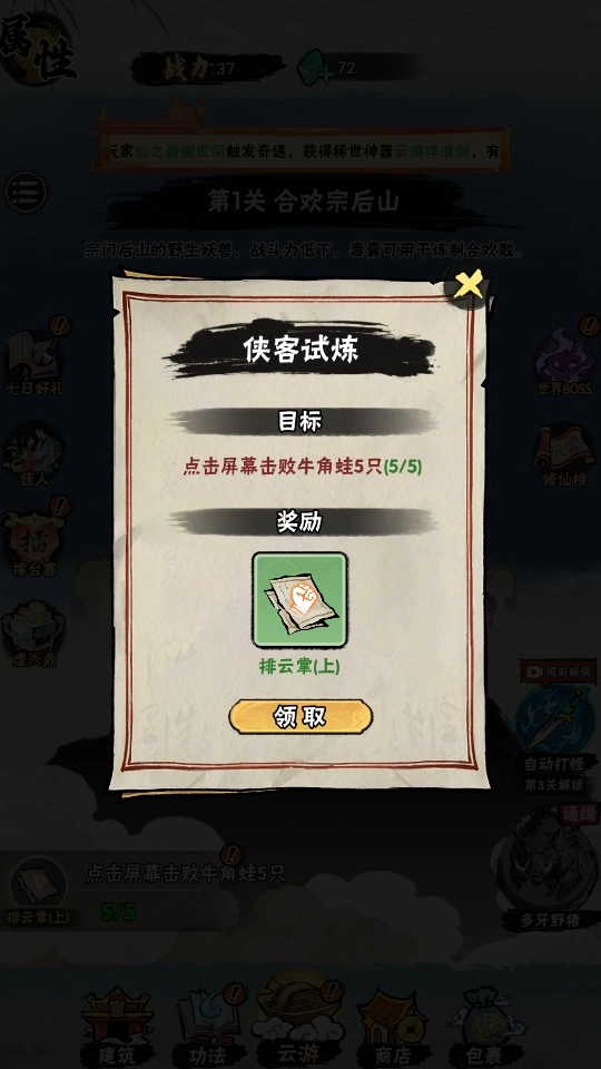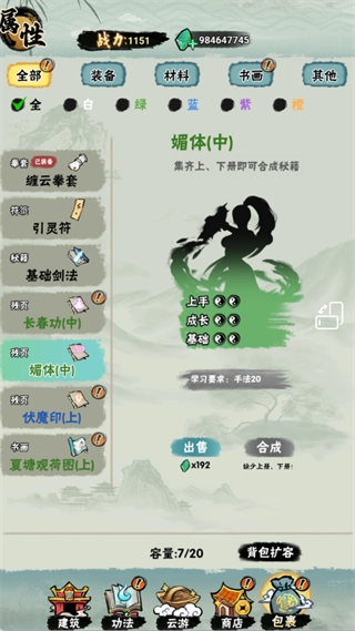 背包可查看已获得的功法残页,集齐对应残页可合成完整秘籍,解锁更强技能。