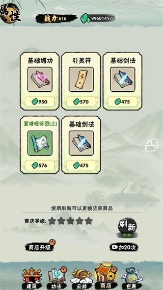 商店可用灵石兑换功法残页、道具,还能刷新货架获取更多资源。
