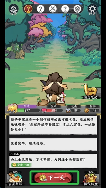 1、进入游戏界面,点击下一天,开始每天的冒险。