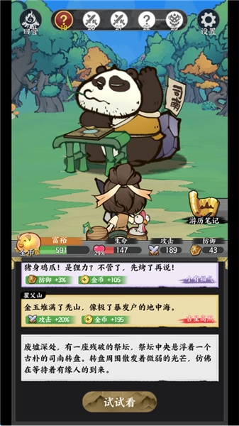 山海世界处处潜藏危机,每一回启程都是绝无仅有的冒险!每一次出发都或许遇上各异的事件、奇遇,还有……呃,糟心事。脚扭了?被烧糊了?不要紧,换种方式再试一次!每一回失败都会成为你下趟冒险的珍贵经验(或是心理阴影)。