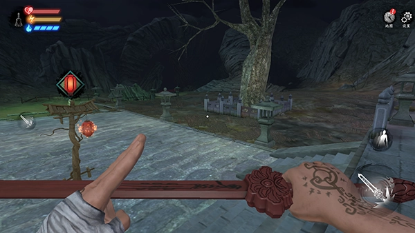 2、点击右下角发起攻击,靠近红色灯笼能够保存游戏进度。