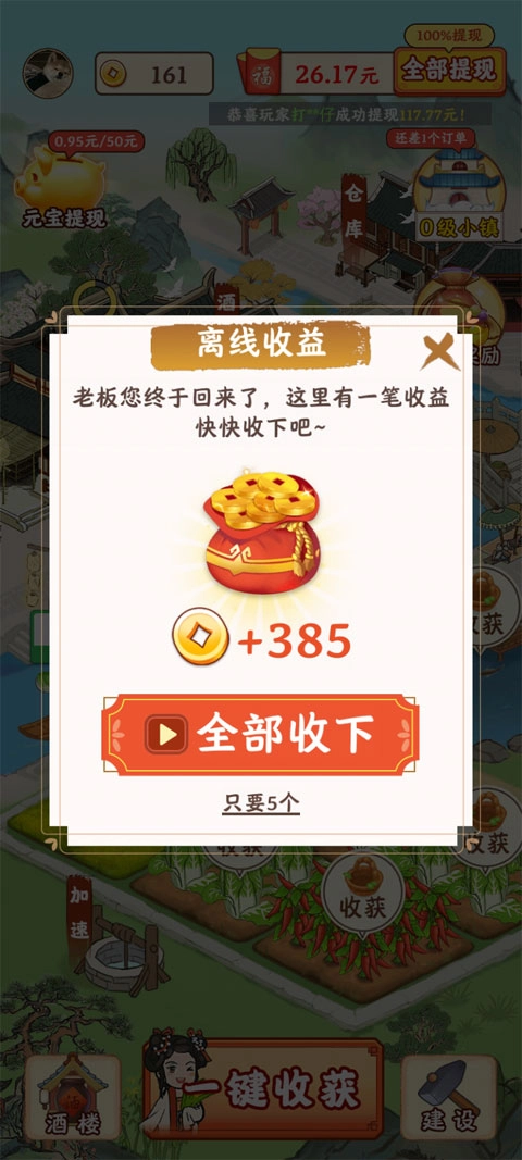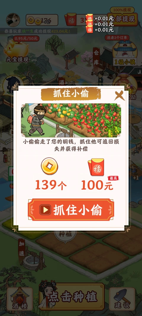 1、打开江南小镇红包赚钱版游戏,离线状态下能获取金币收益 2、种植蔬果、养殖鸡鸭等操作,也可相应获得金币奖励