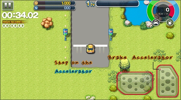 3、如图所示,通过左右操作来控制方向,右下角的两个按钮分别对应加速和刹车功能。