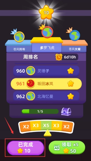 这样就算通过关卡了,点击那个绿色的“领取x5”按钮,就能拿到50星的奖励。