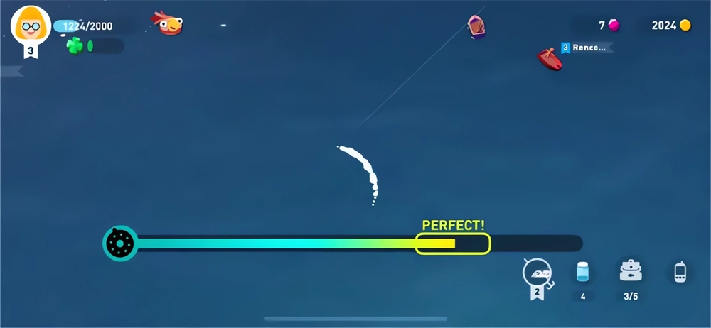 捕捉稀有鱼类的过程充满挑战,毕竟你很难提前知晓何时能成功钓到它们,往往要等到鱼咬钩的瞬间才能确定。钓普通鱼时,操作很简单,只要轻点一下屏幕,渔夫就会自动完成后续的钓鱼步骤。可要是遇到稀有鱼类,你就得更主动地参与其中了:屏幕下方会毫无预兆地弹出一条进度条,你需要做的就是让进度条始终和那个小方框保持重叠,一直到把鱼成功拉到船边为止。