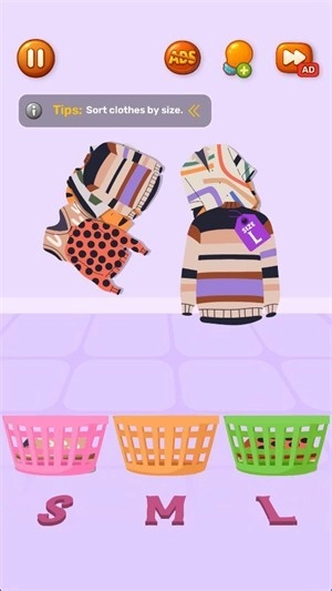 1.点击衣篓会弹出衣服,点击弹出的衣服后会显示码数,需要将不同码数的衣服分别放入对应的篮子中