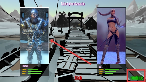 选择角色“RAGNAR”(红箭头所指),点击【CONTINUE】按钮确认该角色,随后即可进入战斗关卡。