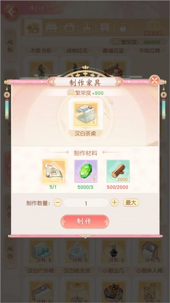 掌柜获取家具的途径包括参与活动、自行制作等;制作家具时需消耗木板,而木板可由农场种植产出。若要制作高品质家具,则还需额外消耗图纸与玉石——图纸可从商店购买,玉石则通过商会投资玩法获取。