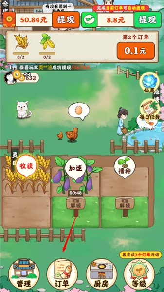 南山小院赚钱小游戏是一款主打种植经营和红包奖励的休闲放置类型的游戏。开局玩家会拥有小块的土地,可以自由选择种植数百种不同种类的农作物,还能够养鸡养鸭来获得农产品。通过浇水、施肥、使用加速道具推进作物成熟。在接收完系统订单后,提交完所要求的农产品就能够获得订单的金币和红包奖励。之后就是不断的升级土地、购买种子来不断的扩大经营范围。