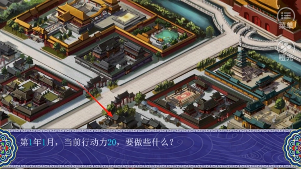 根据行动力数值来规划行动、挑选建筑,确定在第1年1月采取行动,以此推动游戏进度,感受策略规划的机制。