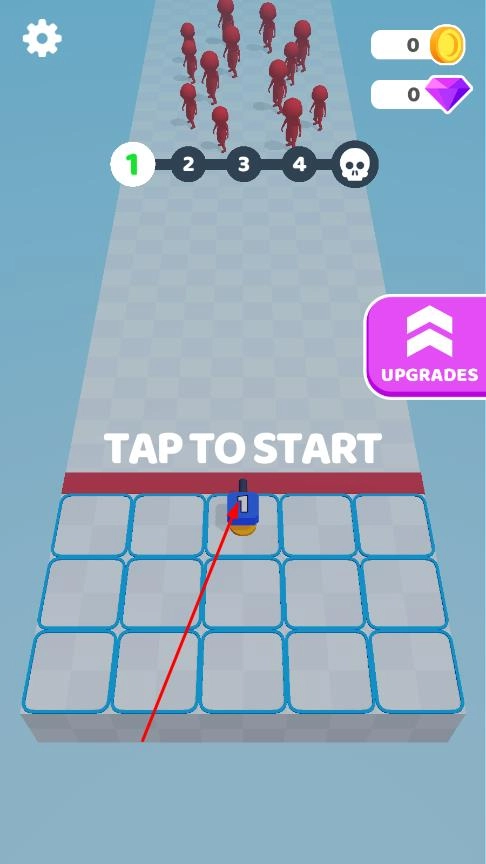 进入界面后,会呈现金币与钻石的数量,界面中间展示关卡进度,点击“TAP TO START”即可开始游戏,界面下方为炮台放置区域,初始状态下会配备带有数字标识的炮台。