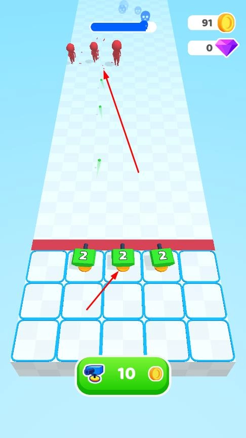 消耗金币即可解锁新的炮台,把数字相同的炮台拖动到一起就能完成合并,举个例子,两个标有数字1的炮台能合成出数字2的炮台。