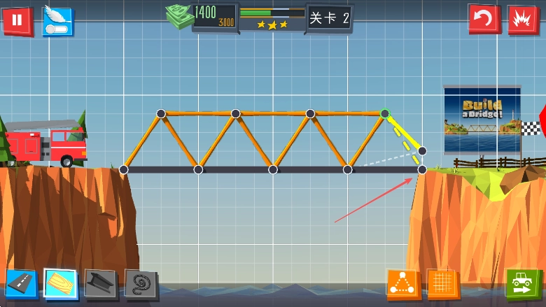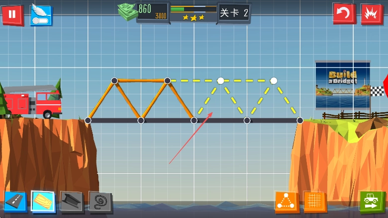 你可以查看屏幕上方显示的金钱数值860、当前关卡为关卡2等相关信息,同时借助下方的材料按钮来规划并搭建桥梁的结构。