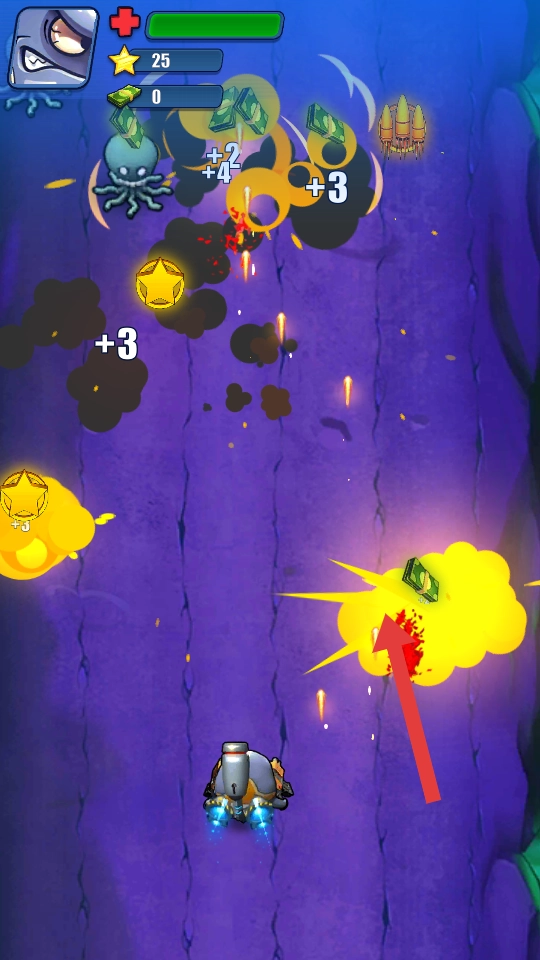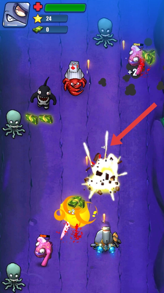 进入游戏后,你需要操控潜艇进行左右移动,瞄准上方的海洋怪物章鱼和虎鲸进行射击。要优先攻击那些距离较近的敌人,避免让它们靠近潜艇。