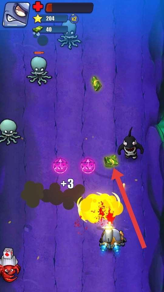 看到金币、血包、XP符文就收集起来,血包可以补充血量,金币攒着用来升级,遇到带有+2、+3标识的道具,要快速拾取。